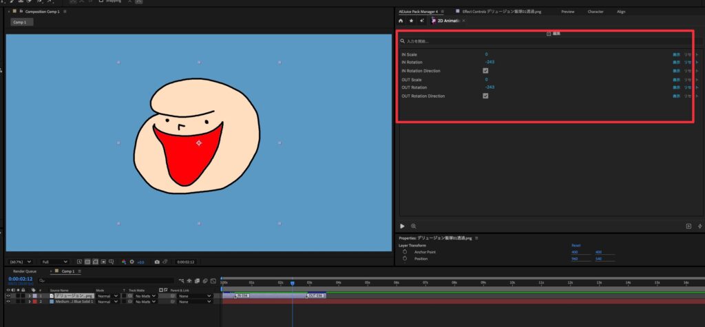 もちろん細かな動きの調節はAE Juiceのウィンドウやエフェクトコントロールから可能です。