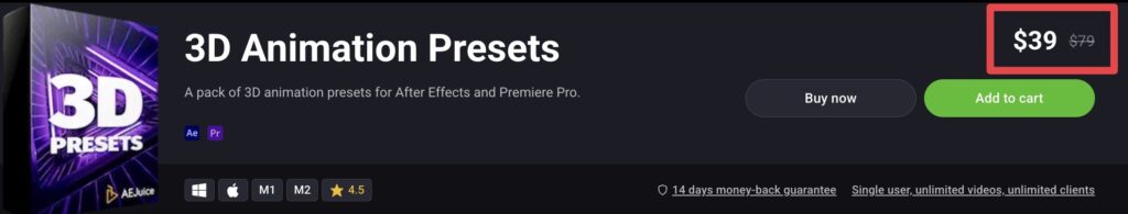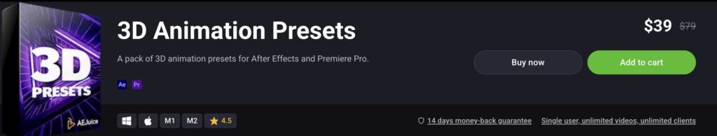 3D Animation PresetsはAE Juiceのバンドル製品、I Want It All Bundleに含まれますのでこちらを買った方がコスパが良くておすすめです。