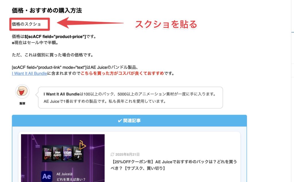 ここでは「価格のスクショ」の箇所に画像を挿入すればOKです。