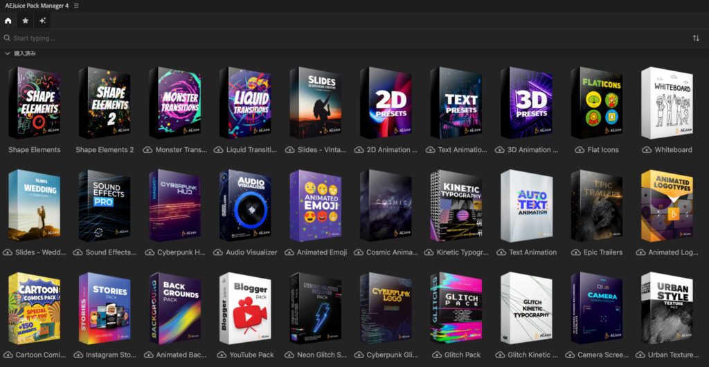 AE Juiceではさまざまなアニメーションパックが使えます。