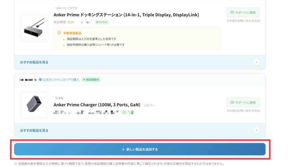 Amazonや楽天などで購入した場合は「+ 新しい製品を追加する」から手動で追加する必要があります。