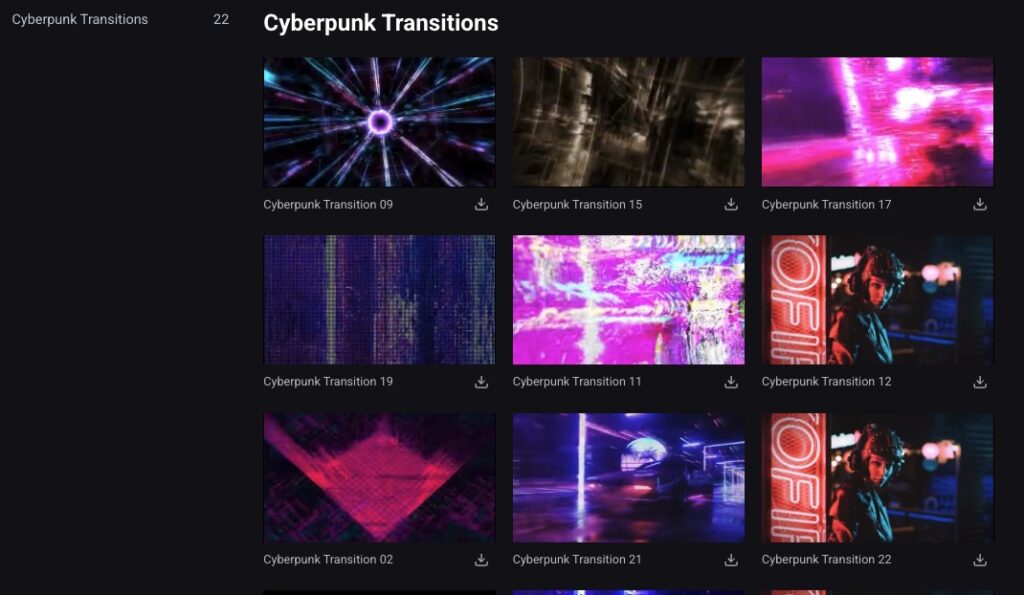 - Cyberpunk Transitionsは、動画に近未来感を出せる、動作が軽くて使いやすいサイバーパンク風トランジションパック!