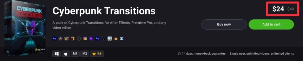 Cyberpunk TransitionsはAE Juiceのバンドル製品、I Want It All Bundleに含まれますのでこちらを買った方がコスパが良くておすすめです。
