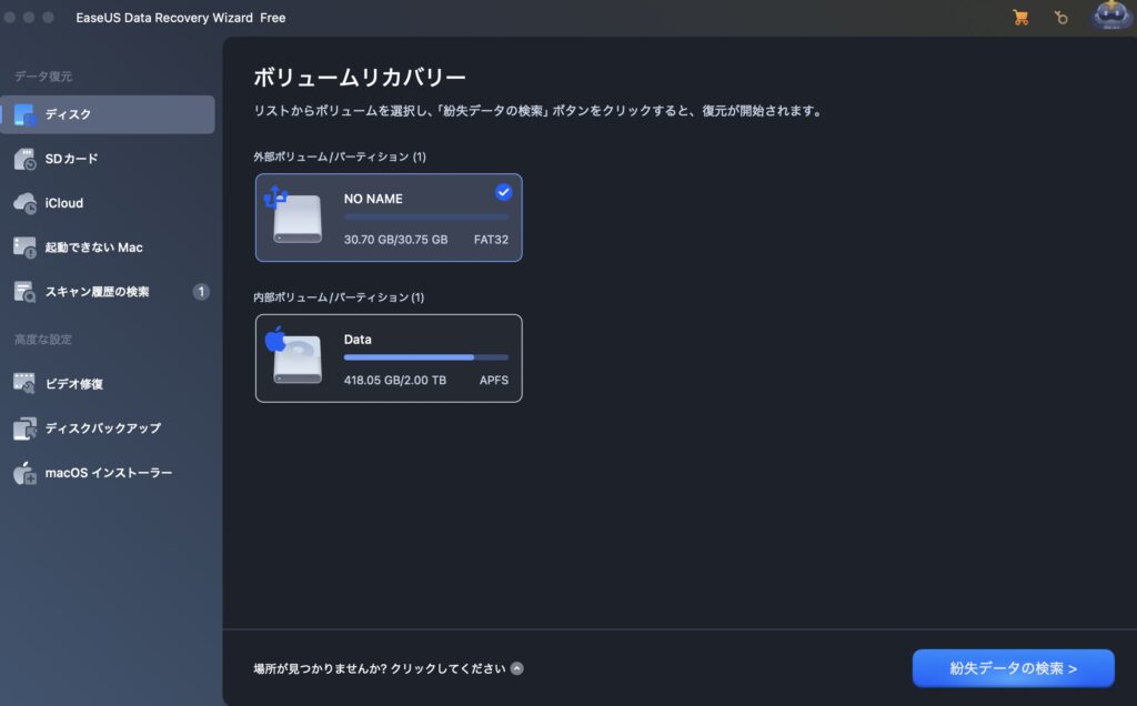 復元はボリューム(ドライブ)単位でスキャンするため、
