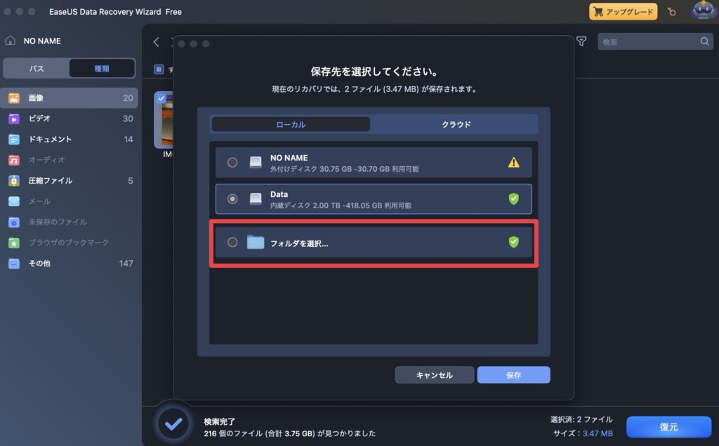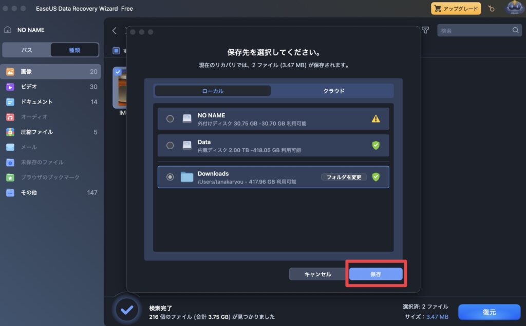 保存先は元あった場所ではなく別の場所が推奨されているので、
