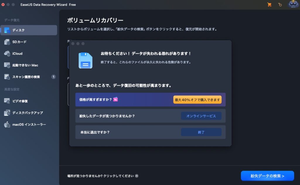 復元しようとした際に有料版の購入を促すポップアップが出る場合があります。