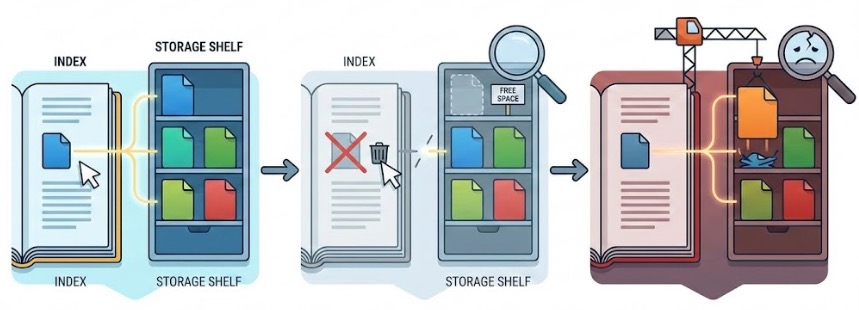 - そのデータが占めていた領域を「空き地(書き込みOK)」としてマークする。