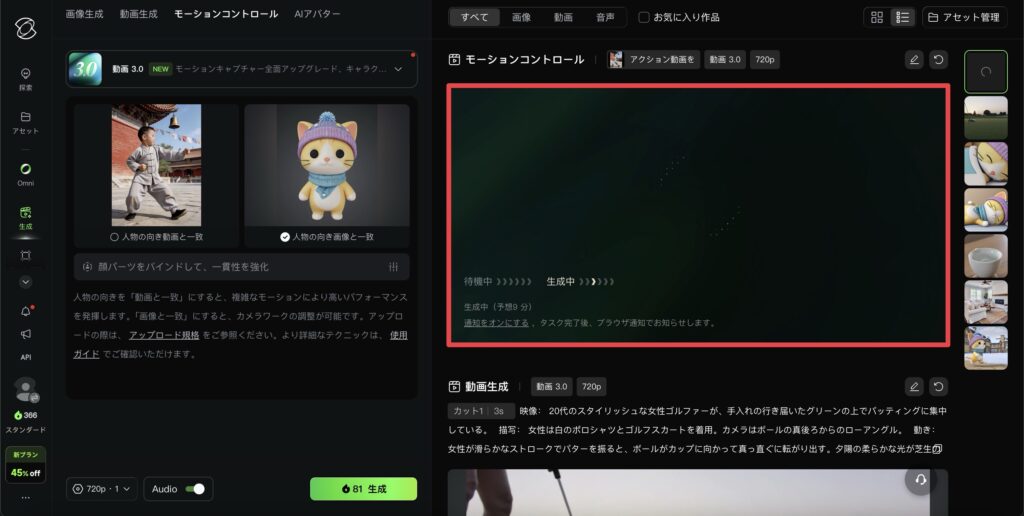 他の動画生成と比べるとちょっと時間がかかる印象ですが、