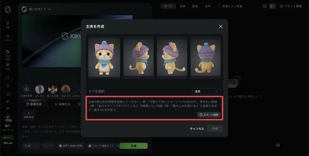 - キャラクター(主体)はOmniから画像と説明文を登録するだけで作成できる