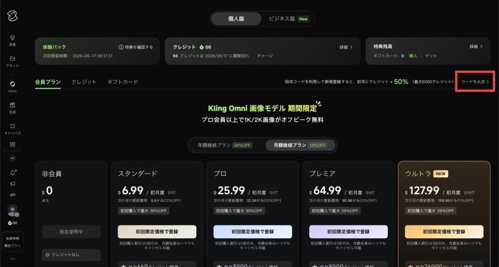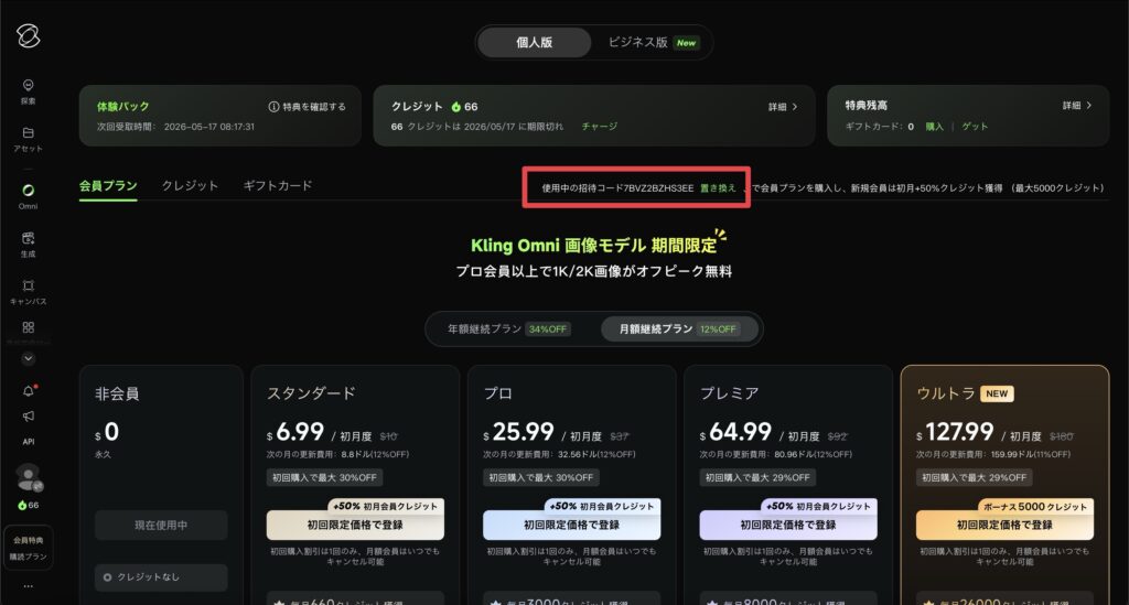• Kling AIを最も安く買う方法は「キャンペーン中に、招待コードを使い、年払いで購入する」