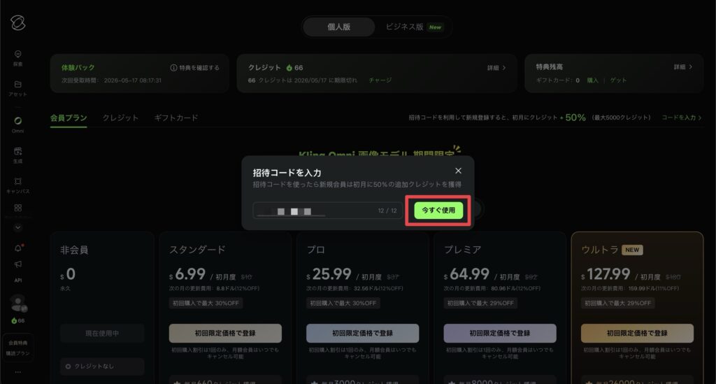 Kling AIはキャンペーン中であれば、