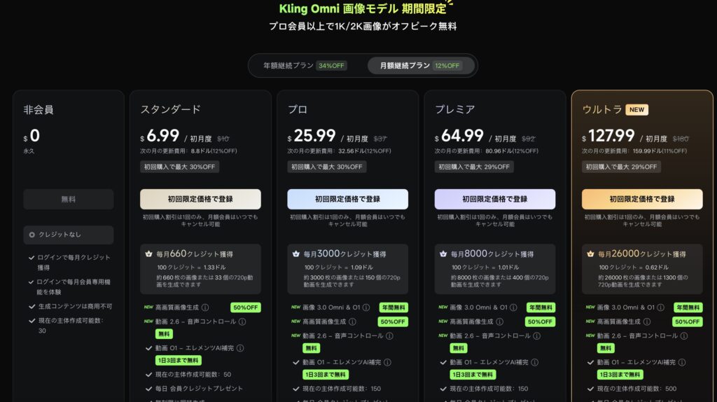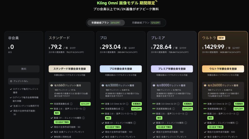年払いの方が月払いよりも30%ぐらいお得になるのがKling AIの基本構造です(※執筆時点)。