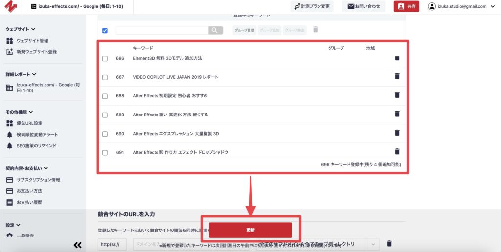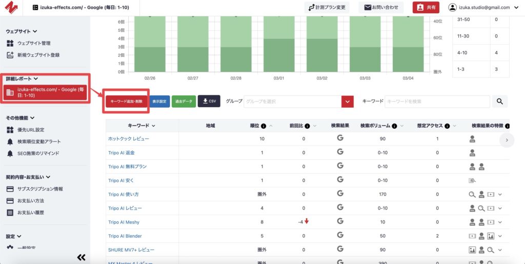詳細レポートから「キーワード追加・削除」をクリックします。