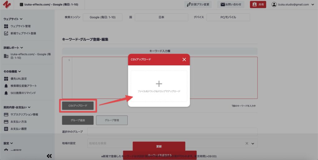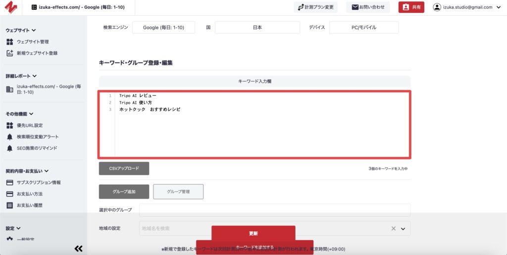 - キーワード登録は「キーワード追加・削除」から手動またはCSVで可能