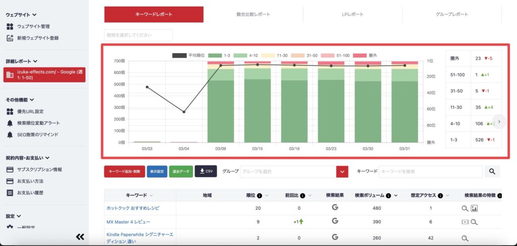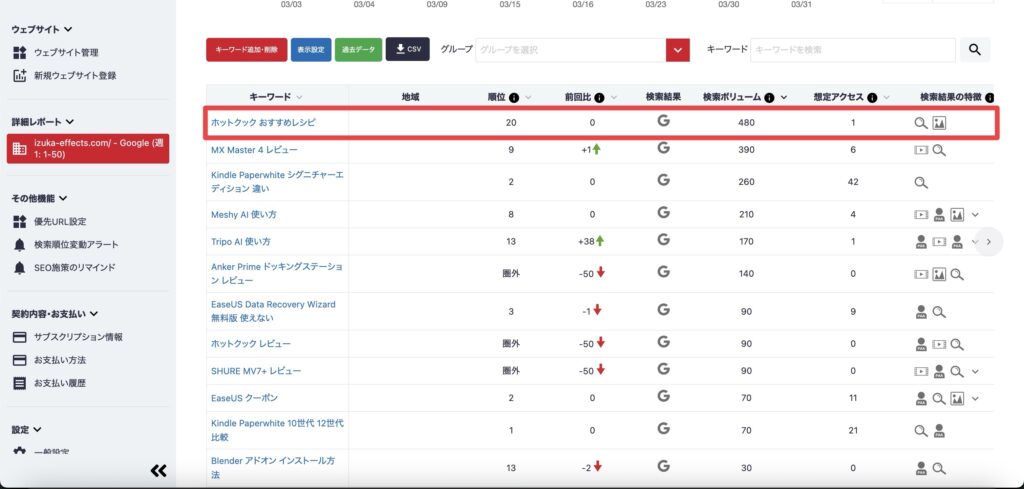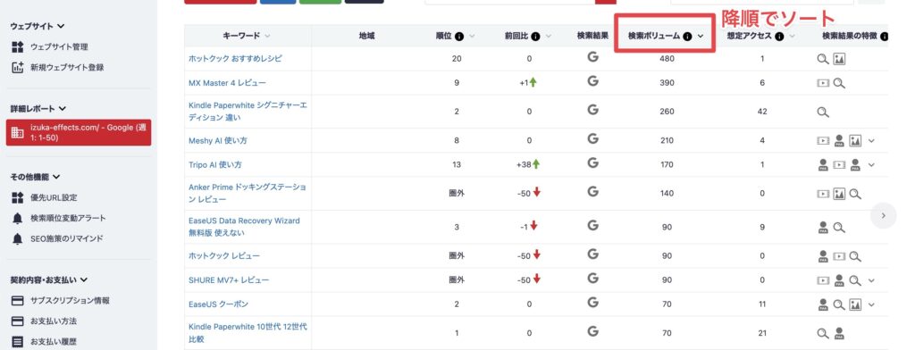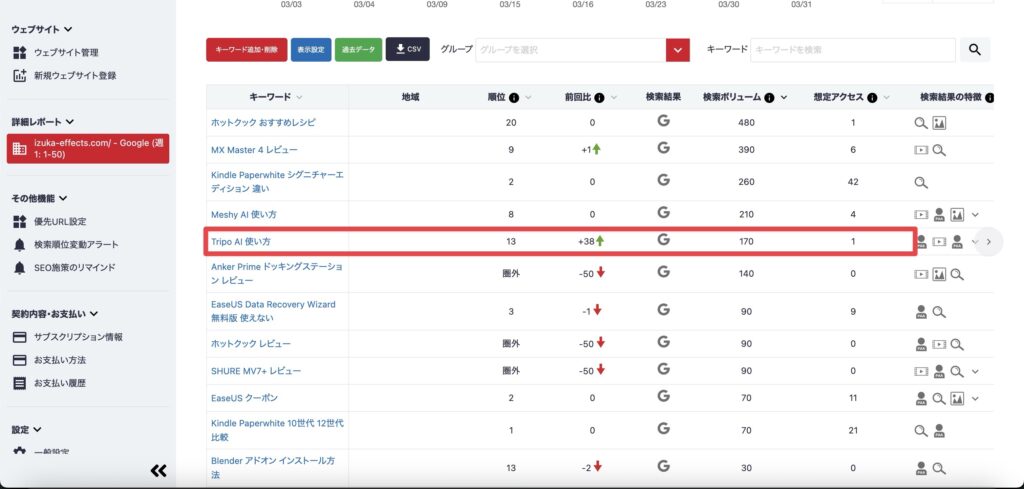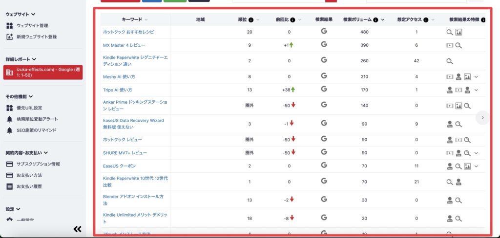 - 計測結果は検索順位・前回比・検索ボリューム・想定アクセスが確認できる