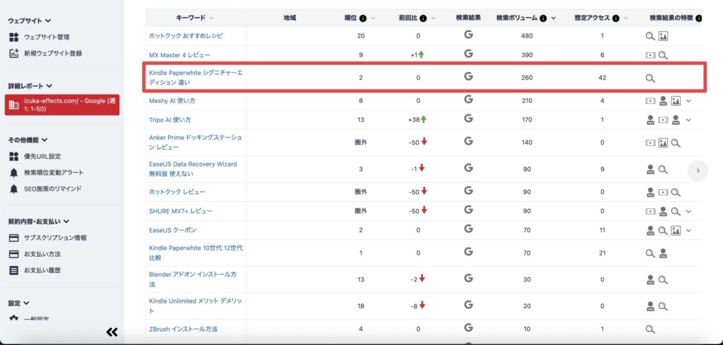 検索順位が20位なので想定アクセス(月間)が1とかなり少ないですね。