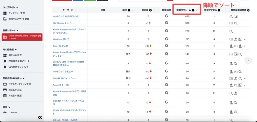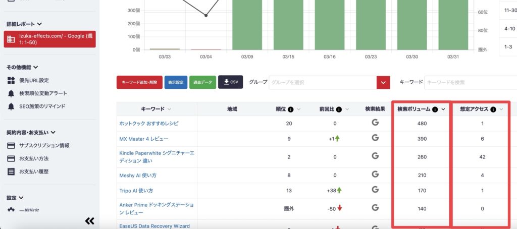さらに検索ボリュームと検索順位から算出される想定アクセス数も表示されるので、