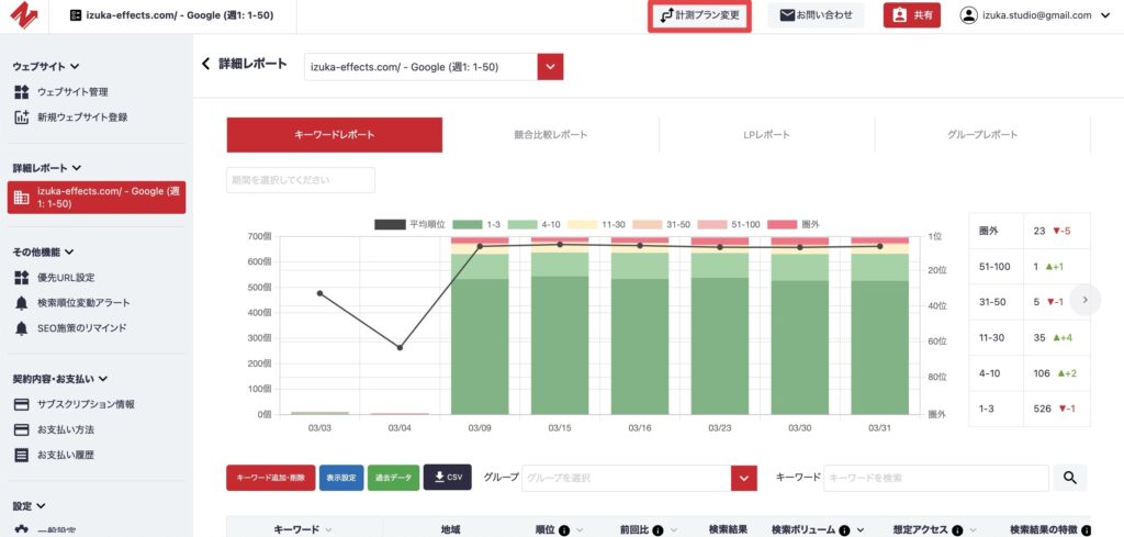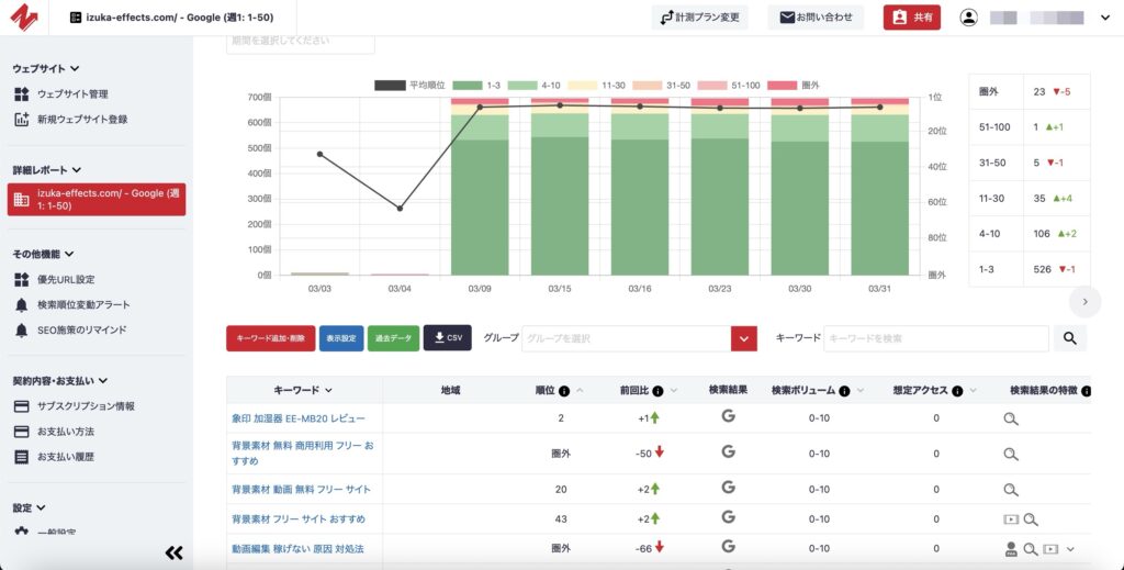 そのキーワードでの検索順位を自動で計測してくれます。