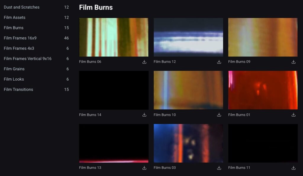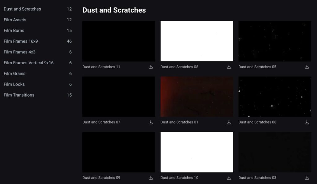 - ノイズやグレイン、トランジション、フレームなどのレトロ風動画用のエフェクトが欲しい