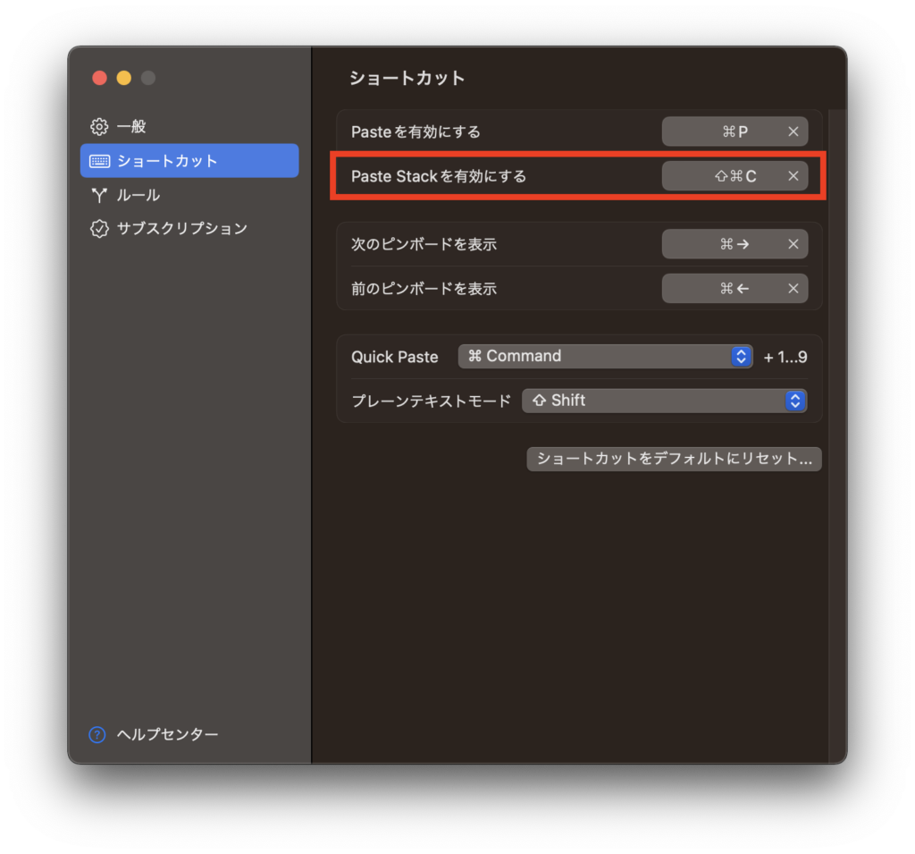 ショートカットの「Paste Stackを有効にする」のショートカットキーを確認します。
