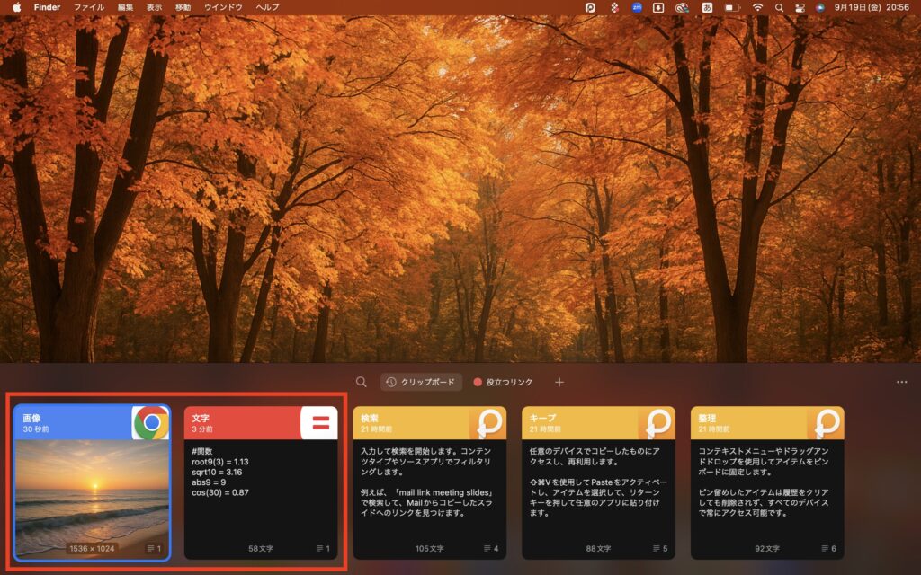 ウインドウ下部にコピーしたテキストや画像がカード形式で並びます。