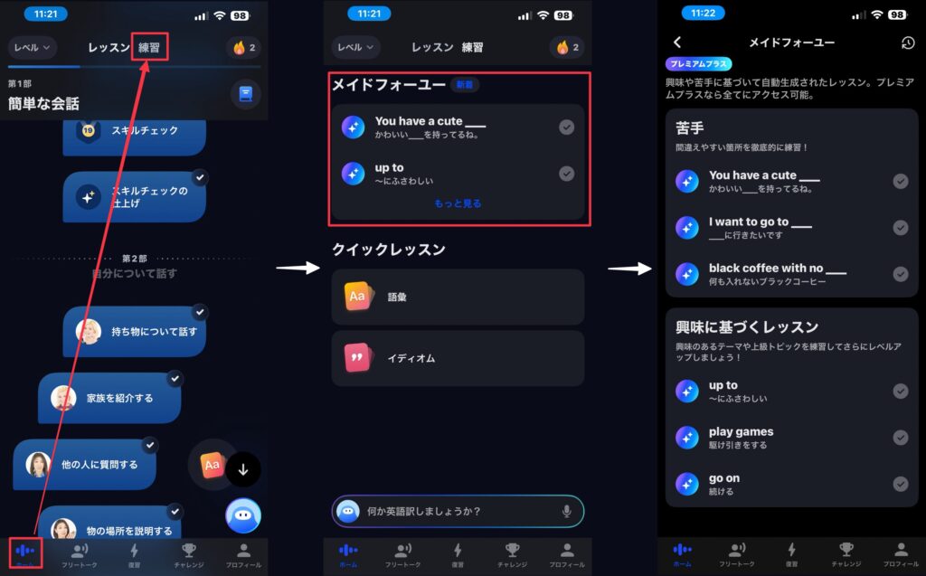 ユーザーにふさわしい復習レッスンを作成してくれる機能。