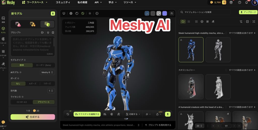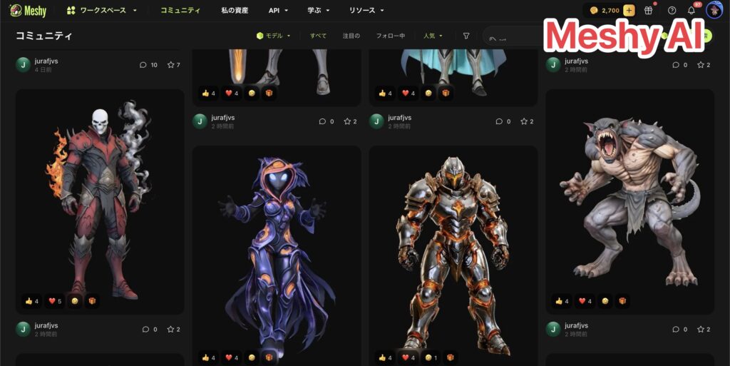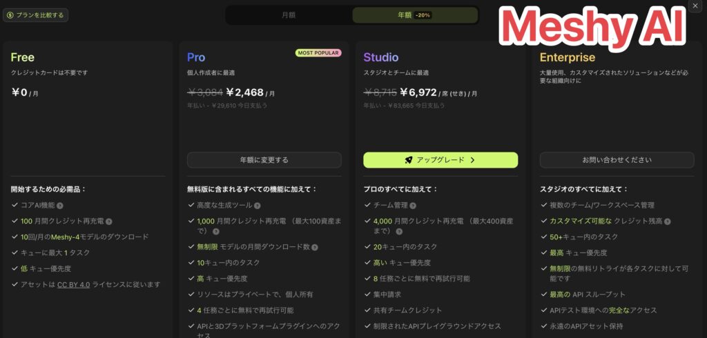 - Meshy AI → 毎月2,468円で33体ぐらい作れる!