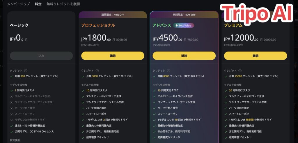 - 価格面ではTripo AIの方がお得(月1,800円で37体以上)