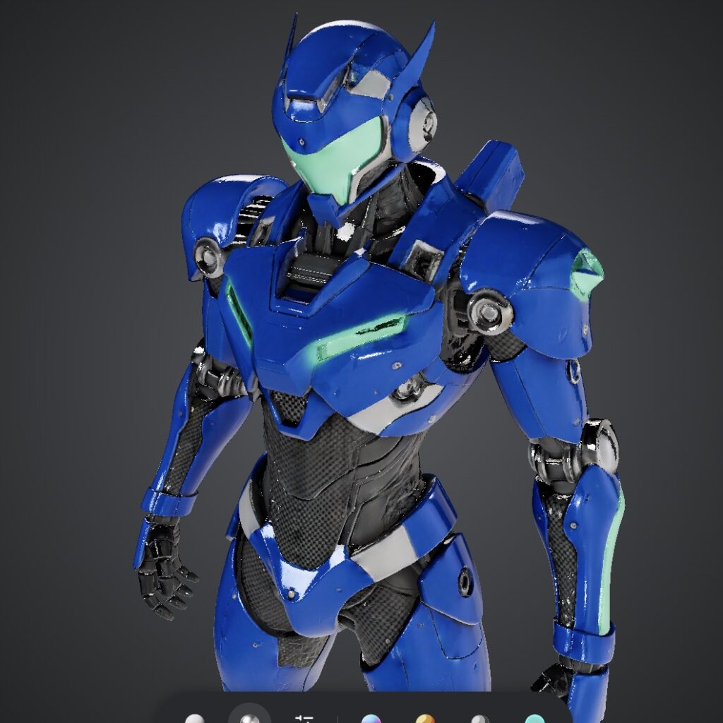 洗練された人型高機動メカ、細身でアスリートのようなプロポーション。メタリックロイヤルブルーの装甲に、シルバーのアクセントとクロームの関節。黒いカーボンファイバーのフレーム質感が視認できる。ほぼ綺麗な仕上げだが、ごくわずかなウェザリング(使用感)がある。胸、バイザー、手足に発光するネオンシアンのLEDストリップ。サイバーパンクの美学、ハードサーフェスモデリング、SF技術。