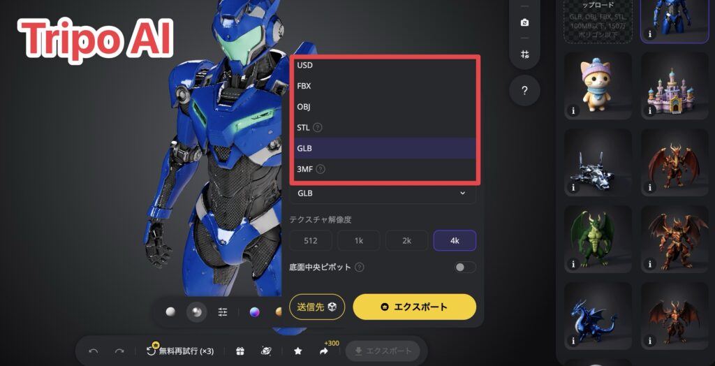 Tripo AIは上記の6つの拡張子でエクスポートできます。