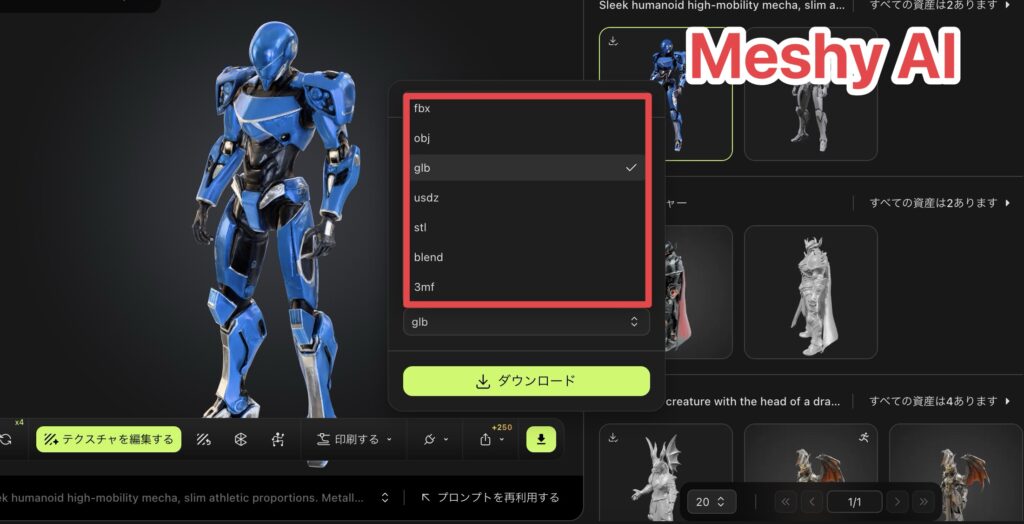 一方Meshy AIはクレジット消費なしでダウンロードし放題です。