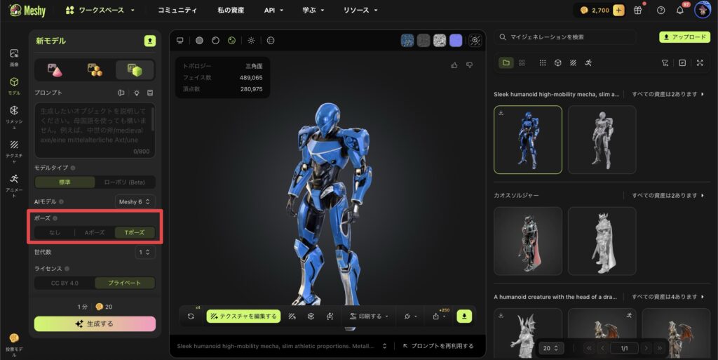 とはいえ、標準でポーズを選べるMeshy AIの方が便利だと思います。