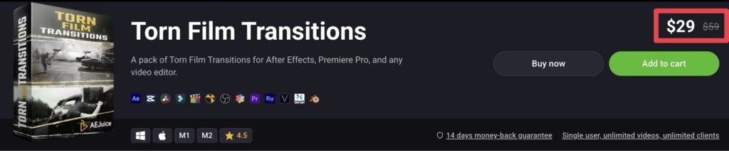 Torn Film TransitionsはAE Juiceのバンドル製品、I Want It All Bundleに含まれますのでこちらを買った方がコスパが良くておすすめです。