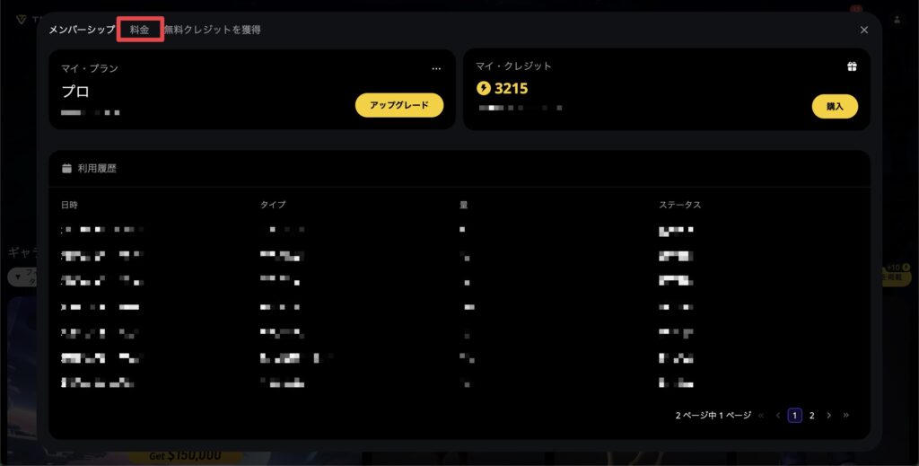 上部メニューの残クレジットの箇所をクリック。