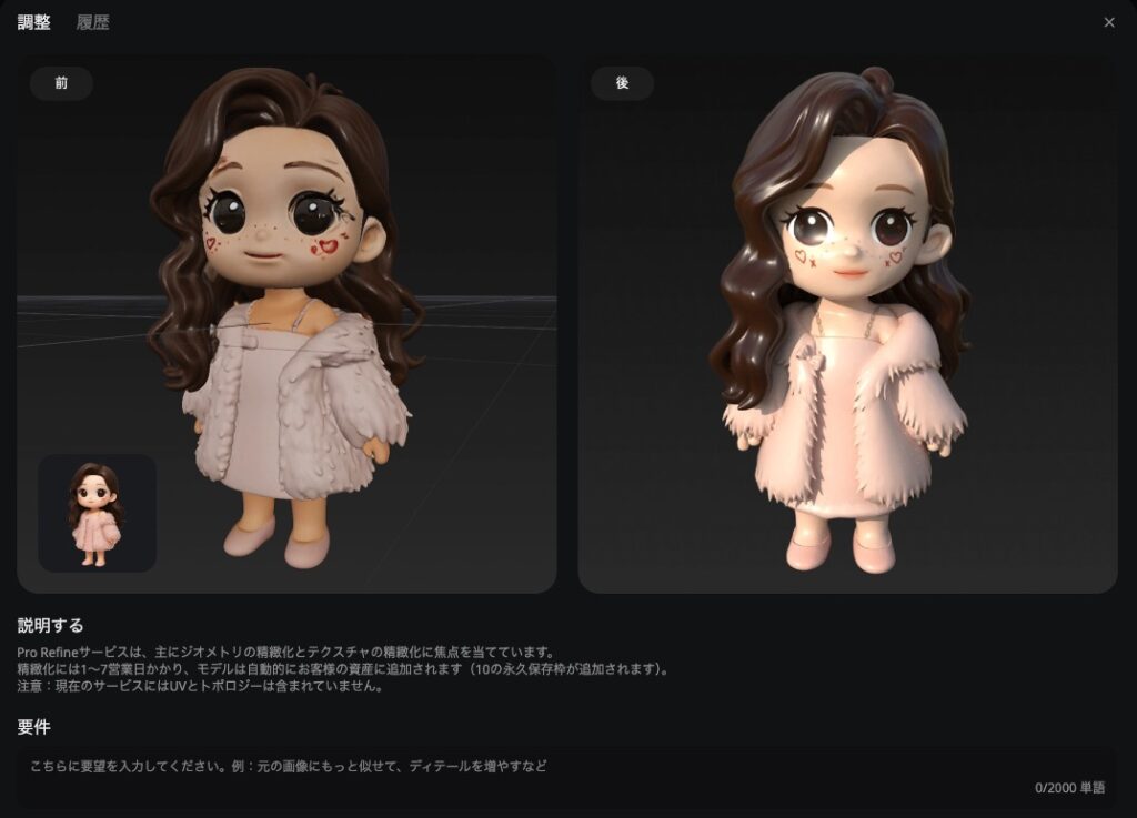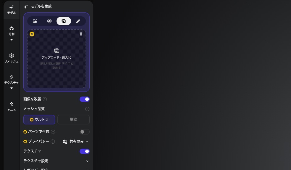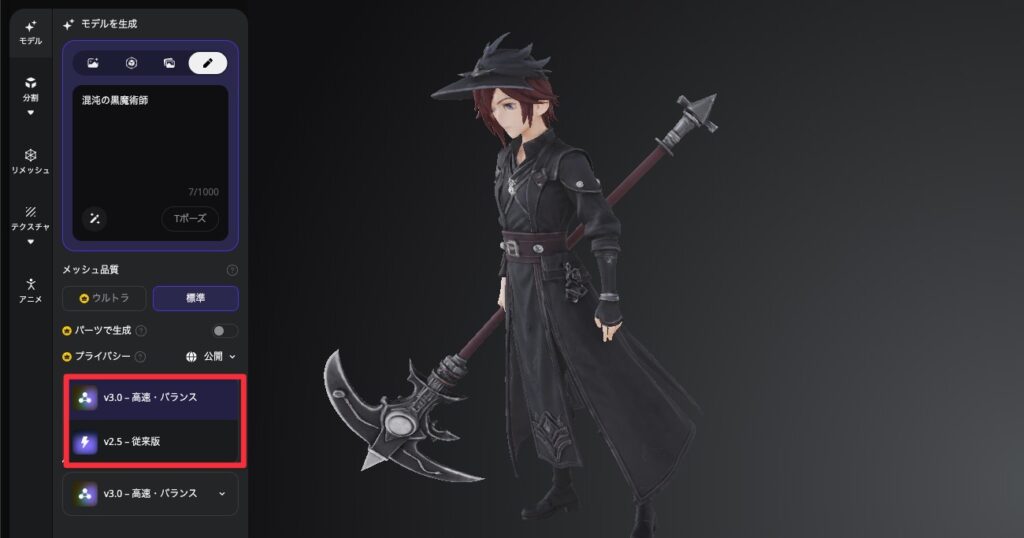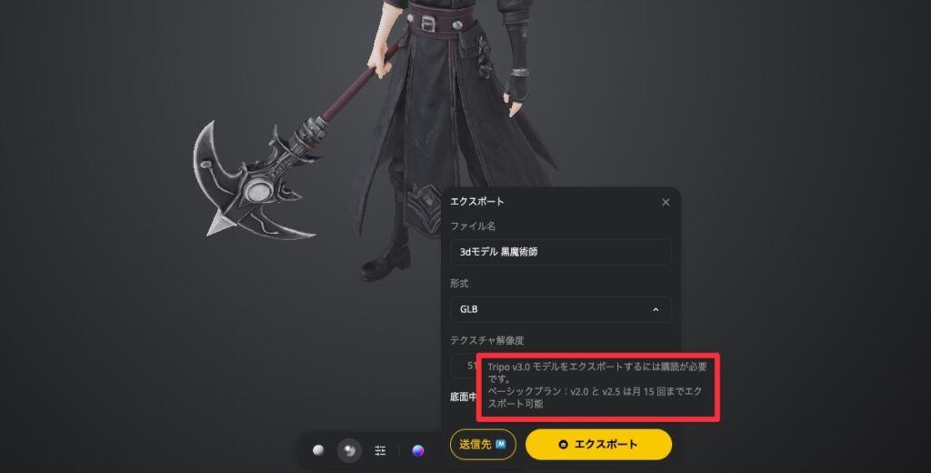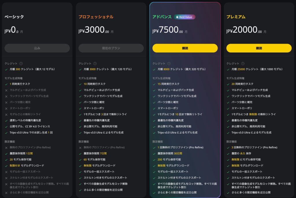 Tripo Ultraという高品質なモデル生成を使えるかどうかという感じです。