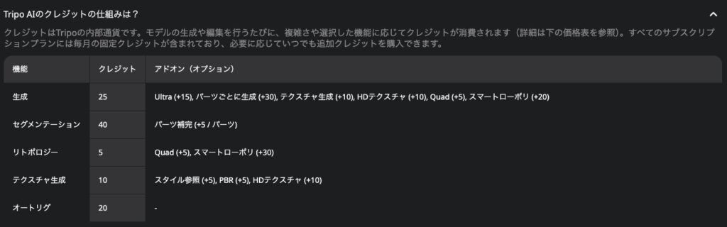 Tripo AIでは、このクレジットを使ってモデルを生成したり、