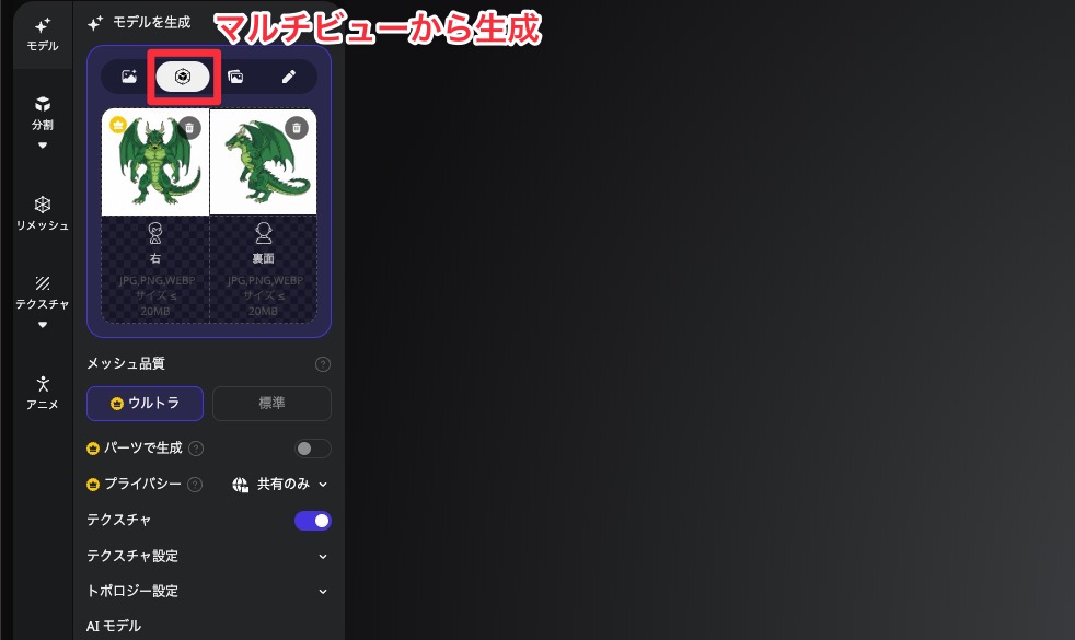 また「画像から生成」のタブから正面の画像だけをアップロードし、