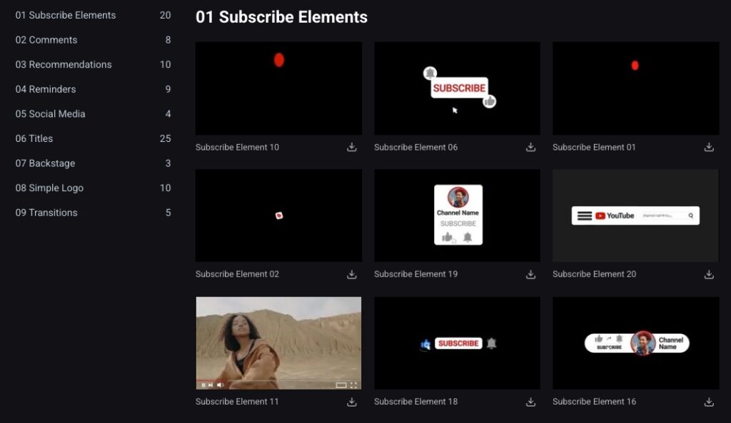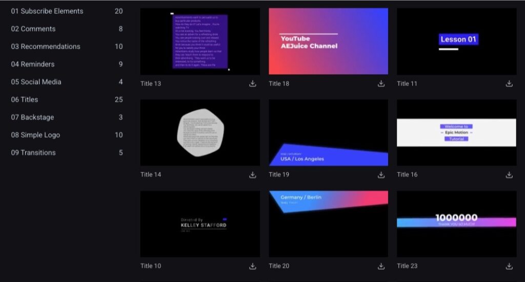 あなたがYouTubeを始めたばかりでも、チャンネルを一新したいと考えている場合でも、YouTubeパックは、あらゆる場面に対応する幅広いYouTube After Effects素材を提供し、あなたの動画を他の動画から際立たせる素晴らしい方法となります。